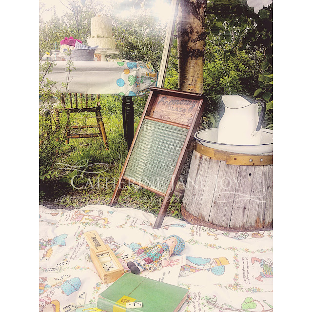 We had so much fun pulling together all of the natural woodland elements that were available to us along with hunting down 1980 vintage holly partyware and fabrics. We picked wildflowers and peonies from our garden...just like Holly would gather in her vintage baskets. We incorporated vintage props from our own prop stash and Grandmas. Sweet treats included Devils food cake and cupcakes with buttercream icing, classic tea sandwiches, and iced lemon water. We read vintage books, played old time dominos and looked at cloud shapes all afternoon.